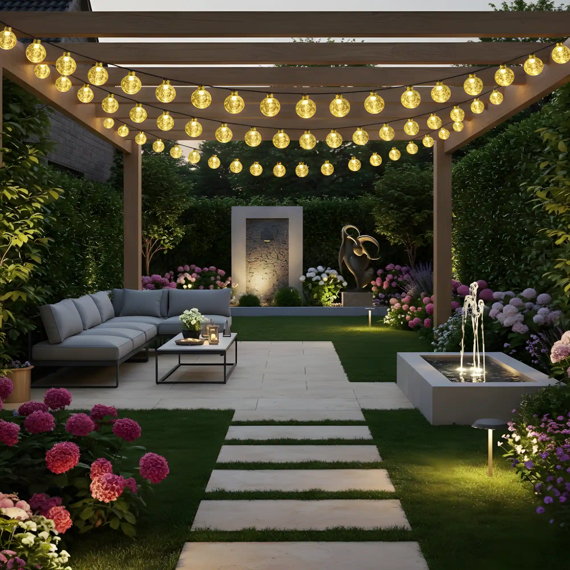 Our premium solar powered fairy lights outdoor feature beautiful 1.7cm crystal ball decorations that create a mesmerising light display unlike ordinary string lights. With an impressive 22 metres of coverage and 200 individual crystal bubbles, these professional-grade solar powered fairy lights outdoor transform gardens, patios, and outdoor events into stunning illuminated spaces.